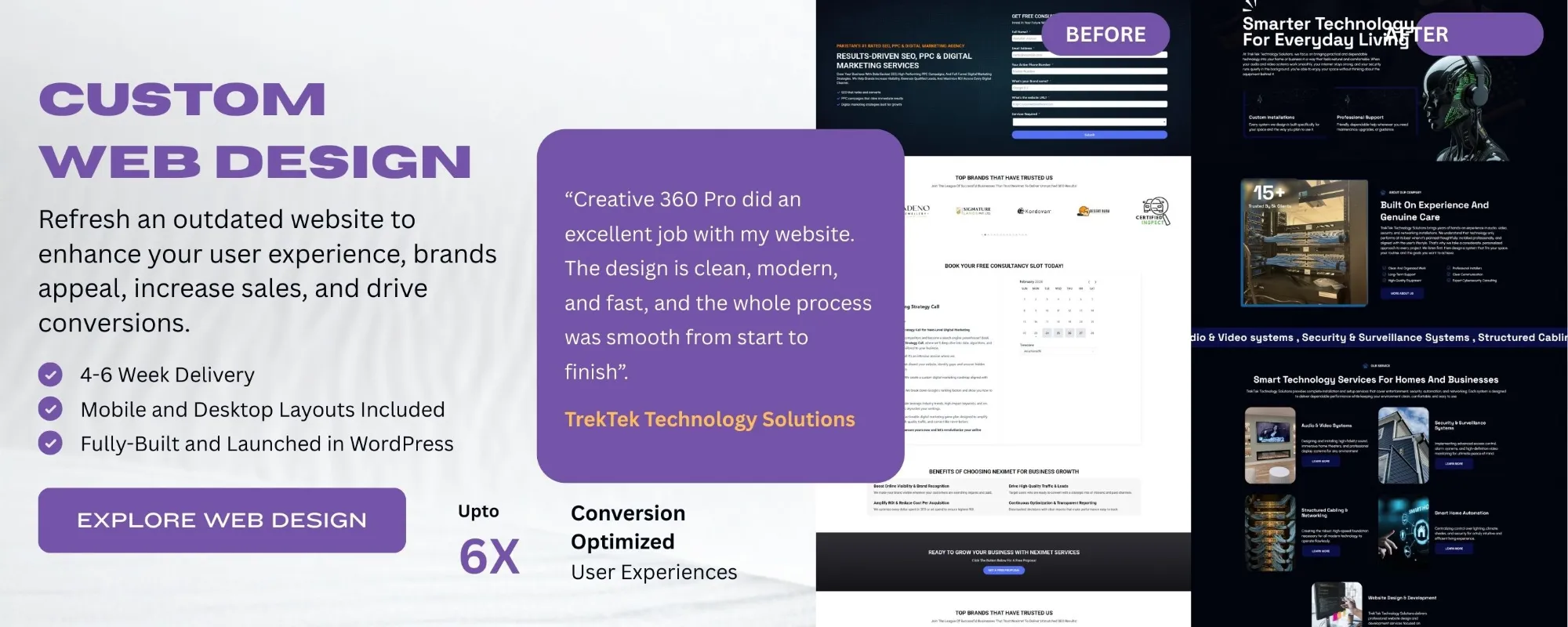 At Creative 360 Pro, we craft high-performance WordPress websites designed to dominate your market. Our expert-driven strategy blends speed, seamless functionality, and conversion-focused design to turn visitors into customers. From concept to launch and beyond, we combine technical precision with powerful digital marketing strategies to transform your website into a scalable business asset that drives measurable results.